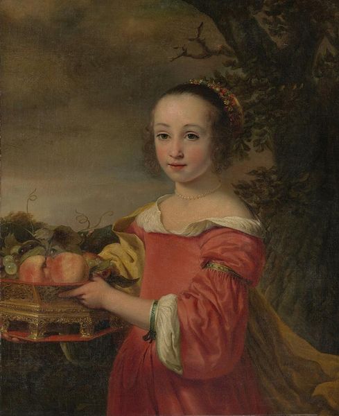 Editor: This is "Mrs. Ezekiel Goldthwait," an oil painting by John Singleton Copley, created in 1771. It's strikingly still. What first captures my eye is the contrasting textures—the smooth fruit against the intricate lace. What do you see in its composition? Curator: Notice how the geometry governs the arrangement. The circular table anchors the composition, a deliberate counterpoint to the figure’s more subtle triangular form. The light, predominantly focused on the still life and Mrs. Goldthwait’s face and hand, creates a stark contrast with the somber background. What function might this contrast serve, do you think? Editor: Perhaps it directs our gaze. The luminescence on the fruit almost suggests a moral allegory. There's definitely a tension between wealth and modesty here, even luxury and restraint. Curator: Precisely. The rendering of each element invites contemplation. The precision in the fabric's folds, the minute detail in the lacework. Do you feel this focus on detail lends the artwork a sense of psychological depth, or something else? Editor: While the detail is amazing, I’m not sure about psychological depth. The subject’s gaze doesn’t quite invite introspection, more like presentation. Still, it really invites the eye to roam around, soaking in all those precise details you pointed out! Curator: Yes, the painting thrives on pictorial devices: texture, color, contrast. Form here dictates everything. Editor: I agree, concentrating on the interplay of form definitely made me appreciate how each aspect, even the subject's gaze, helps the composition work in the Baroque style. Curator: Exactly, considering how form contributes meaning unlocks layers that narrative approaches might miss.