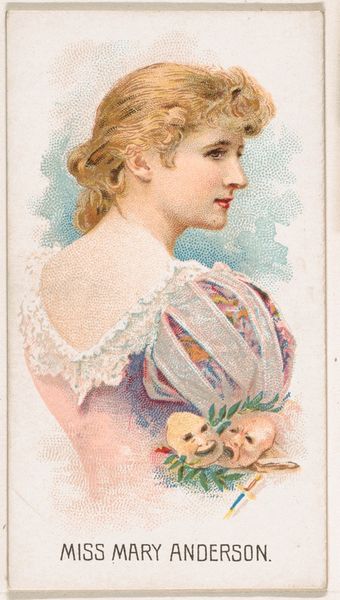 Curator: Ah, this portrait has an innocent sweetness about it. Look at that pink bow. Editor: Right, what we're gazing upon here is a card featuring "Miss Fannie Rice," part of the "World's Beauties, Series 1," produced in 1888 by Allen & Ginter Cigarettes. It’s currently housed here at The Met. What grabs you beyond the bow? Curator: It's all so blushingly romantic, I think. She reminds me of those sweet perfume ads. The pearl necklaces dripping, a rose perched just so… and yet there's also something…mass-produced about it. It’s a strange little combination, the intimate and the commercial. Editor: Definitely! The pearls evoke, for me, a Victorian obsession with adornment but presented here in the service of marketing, and it's done with such care. These weren’t slapdash things; the artists used colored pencils, sometimes even printing processes, to capture a delicate realism, however idealized. The Victorians equated pearls with purity, but these were also luxury objects flaunted as such! Curator: Like visual cigarettes. I’m struck, really, by how the pearls dangle freely, almost unconnected… A deliberate strategy, I wonder? And it all contrasts with this kind of generic beauty they're selling. Were these cards truly collectible, or simply meant to be disposable? Editor: Excellent point! Well, that "World's Beauties" series spoke directly to Victorian fascination with female images from the stage, for instance, while fueling tobacco sales. It tapped into aspirations, societal status and of course, conspicuous consumption! The images became quite ubiquitous during their day but also preserved specific beauties through popular media, much like postcards! It's also why she appears without narrative symbols, or objects; she is an archetype! Curator: I hadn't quite considered her archetypal role. What do you mean? Editor: She doesn't represent a biblical or historical personage but rather stands for generic "beauty" with its own evolving iconography and values of the time. She's the embodiment of ideal beauty to be replicated! And purchased, too, like Allen and Ginter Cigarettes! Curator: Looking again, I see that archetype playing out in her demure pose and upward gaze. An interesting way to distill notions of female beauty... Fascinating that even a small, ephemeral item like this has so much to say. Editor: Exactly, it allows a modern gaze into the aesthetics and marketing machinery of the Gilded Age! I wonder if she herself realized how broadly her image was being circulated…