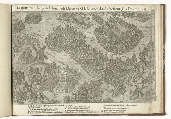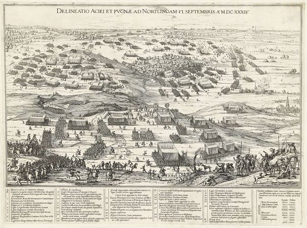 Curator: Jean Perrissin created this etching, "Slag bij Saint-Denis," sometime between 1569 and 1575. It portrays a panoramic view of the Battle of Saint-Denis. Editor: My first impression is a controlled chaos. The scene pulses with the sheer density of figures and implements, all meticulously rendered with that crisp line work. Curator: Indeed. Look at how the artist used etching to create an atmosphere filled with the tension of this battle scene. Notice, for example, the repeated lances in the central army...the repeated angles seem almost geometric, abstracting the sense of movement in the overall conflict. The composition reflects a highly conventional mode of historical representation—the battlefield spread before us. Editor: But the level of detail elevates it. Think about the sheer labor involved in creating so many tiny, distinct lines. The process of etching itself, using acid to bite into the metal, feels violent, mirroring the very event being depicted. You can almost feel the artist leaning into the resistance of the material. Curator: Yes, and it resonates with symbolic meaning! In Mannerist art, this visual density, this abundance of figures and activity, often signifies the chaos of earthly life, but it can also be an allusion to the futility of war. Notice the chaotic field extending toward the town and country landscape. These all convey a symbolic interpretation of temporal instability and earthly suffering, as seen in Christian religious art. Editor: That's an interesting take, how religious symbolism is applied to history. And the social implications of printing at the time, the proliferation of these kinds of images allowing for wide circulation of interpretations. Were the lances, horses, costumes, and artillery all rendered in a realistic mode, based on observed social details? Or did some symbolism inhere within such forms? Curator: Considering the time in which the print was executed, they likely held very specific connotations. This battle has taken on almost mythic proportions by the time it was turned into an etching, don't forget. So Perrissin wasn’t simply creating a replica, but an interpretation embedded with symbolism and lessons. Editor: It's this tension between the material production, and the enduring social function of such printed images, which I think provides such a rich and intriguing case for rethinking what we think we know about the image, and images as vehicles of historical knowledge. Curator: Precisely. An intricate combination of process, observation, and symbolic meaning, capturing more than just a historical moment.