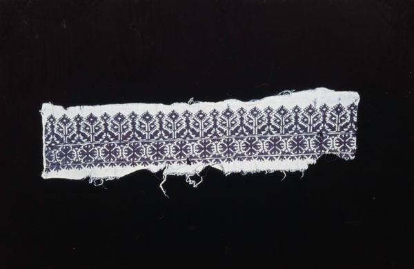 Curator: What strikes you first about this textile band? To me, it feels spectral. Editor: There's an immediate sense of muted grandeur. The scale hints at something significant despite its faded hues, like whispers from another time. Curator: Indeed. It's believed that this piece dates back to the 16th or 17th century. The "Band," as it's simply known, resides here at the Minneapolis Institute of Art and represents decorative art, showcasing intricate fibre work. Editor: The repeated geometric patterns… It's interesting how such simple forms can create a visual rhythm that holds the eye. Almost like an elaborate code waiting to be deciphered. Curator: Precisely, especially within the realm of Islamic art. We can explore the potential narratives held within the symbols and repeated motifs. Look closer; see the subtle animal forms woven in among the geometric figures? Do you think they are real, fantastical, or imagined beings? Editor: Yes, those elusive figures lurking within the gridwork hint at life… creatures in motion and that breaks the stern regularity with a soft note. The artist might explore themes such as power, connection, nature or hierarchy. Curator: And how does the craftsmanship itself—the delicate weaving, the material— speak to the historical period? Does the surviving fragment suggest resilience, artistry, something deeper, something now lost? Editor: It echoes resilience—like a survivor of wars. The textile seems to offer both beauty and cultural persistence across eras. Curator: It's a profound demonstration of how material culture serves as a tangible connection to the past, giving echoes of an otherwise unreachable world. Editor: Exactly. This small piece prompts an entire world to blossom inside us.