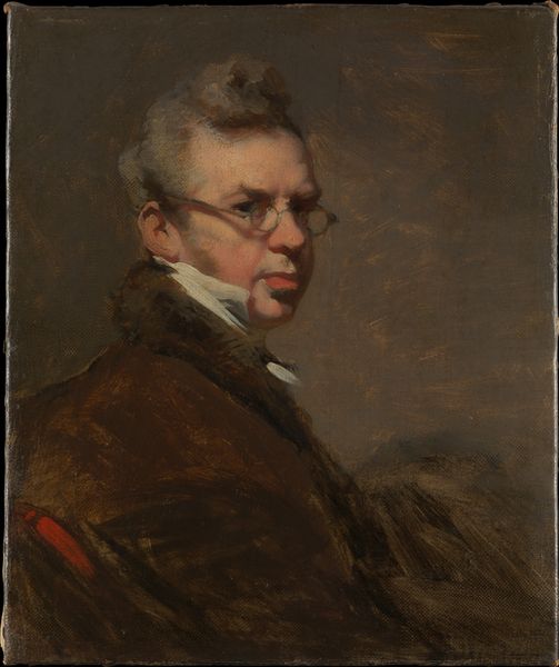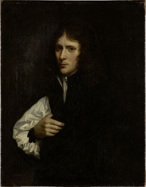 Curator: Carel Fabritius' "Young Man in a F R Cap Self Portrait" from 1654 is a remarkable piece, offering an intimate glimpse into the artist himself during the Dutch Golden Age. Editor: Immediately, the somber mood strikes me, a quiet introspection. Notice the loose brushwork and the contrast between the muted tones and the reflective armor. It is a captivating study in light and shadow, but the effect is of great restraint. Curator: Indeed, and it’s important to consider Fabritius' historical context. As a student of Rembrandt and teacher to Vermeer, his unique approach, particularly his mastery of aerial perspective, greatly influenced the subsequent generation of painters, a key turning point for the time. Editor: Absolutely. The painting's material presence contributes significantly to the reading. The visible brushstrokes are so active, which contrasts rather strongly with the placid subject. And the composition directs us there, emphasizing the interplay of the colors—the earthen tones set against the stark brightness near the neck. Curator: What I find truly compelling is the blurring of boundaries, not only in the hazy backdrop that feels incomplete but more critically within his attire: the youthful exuberance juxtaposed with armor reflecting the era’s political instability and the individual's role within the broader socio-political sphere. Editor: But doesn’t that inform the symbolism we see within? Armor suggests more than defense; in a self-portrait, this motif speaks to how the artist presents his professional and artistic self to the world— perhaps against the prevailing style within his peer group. The painting's appeal comes down to the formal balance achieved here, despite an underlying tension. Curator: Your perspective highlights the genius of the portrait— it seems to echo his own life's delicate balance: a bright promising painter unfortunately cut short in his life from a gunpowder explosion in Delft. Perhaps there is even a foreshadowing, when seen with historical context. Editor: Perhaps we both were swayed today by the work's somber notes—considering both form and historic placement provides layers of appreciation for such subtle strength!