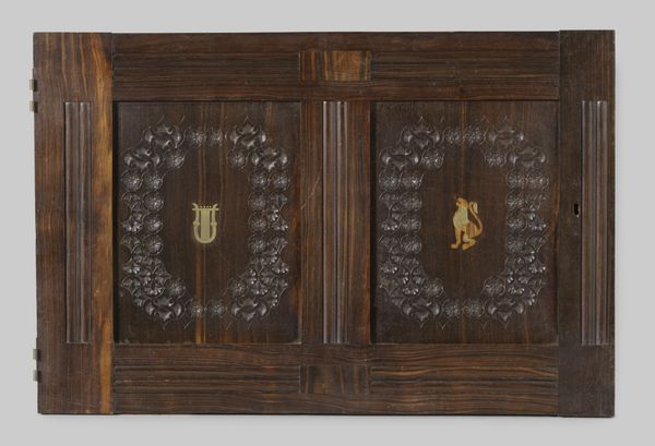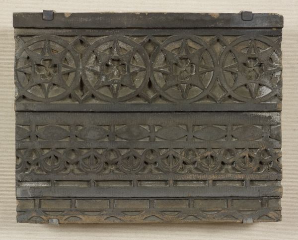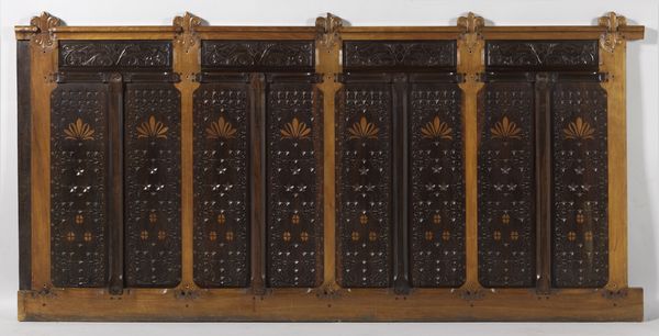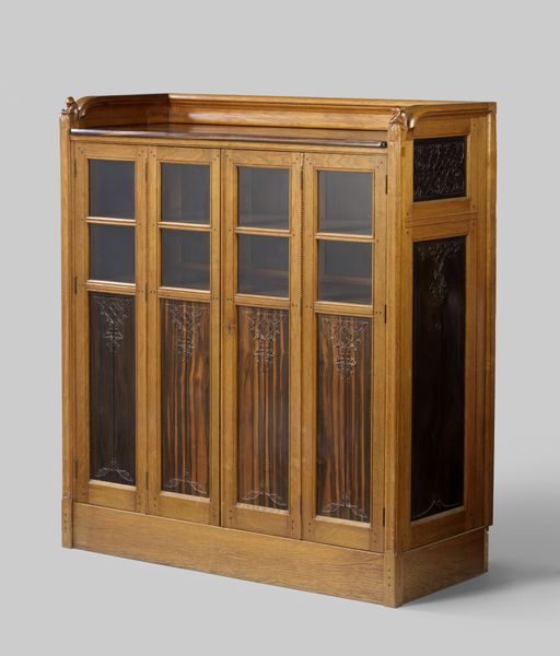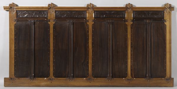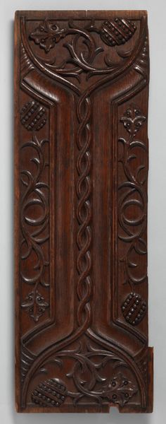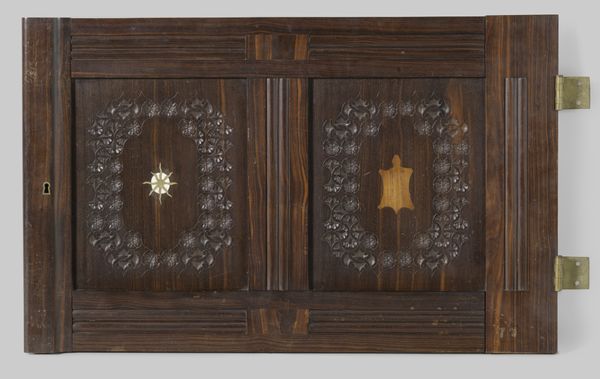 Curator: I'm struck by the imposing nature of these panels. They command a certain reverence with their height and meticulous carvings. Editor: Indeed. We're looking at 'Deel lambrizering, afkomstig uit het huis van Dentz van Schaick', dating back to circa 1900-1905, now housed here at the Rijksmuseum. They were crafted by Carel Adolph Lion Cachet, a name synonymous with Dutch Arts and Crafts. The panels feature intricate wood carvings in relief. Curator: The wood itself presents a dichotomy—the light framing wood provides a vivid border around the darkly stained carved panels, almost a literal framing of art itself, and the symmetry really heightens a sense of formalized aesthetic intention. The details seem painstakingly rendered; I see repeated geometric motifs and stylized floral elements, but are there suggestions of specific meanings beyond just decoration? Editor: Cachet was deeply influenced by the Arts and Crafts movement, a reaction against industrialization. The movement emphasized handcraftsmanship and the integration of art into everyday life. These panels would have originally been part of the wall panelling, a decorative interior feature that reflected a wealthy patron’s taste and social standing, so the carved details speak to the socio-economic contexts and a renewed appreciation for skilled artisanship, reflecting ideals of beauty. Curator: Do you see in the designs any reflections of the architectural trends and aesthetic philosophies that would have been present at the time of the construction of the home? Editor: The stylistic and patterned carvings definitely reflect a desire for visual complexity; there seems a deliberate integration with architectural trends and styles, particularly the aesthetic values that were being established by Dutch elites at that time. These are not simply decorative additions but intentional displays of social identity, revealing specific details about how people desired to express themselves within these walls. Curator: A fitting addition to the museum, showcasing the layered dialogues that emerge when the aesthetic meets the historical. Editor: Absolutely, viewing it in terms of texture, materiality, and composition allows us to trace the aesthetic intent while revealing compelling clues about this cultural moment.