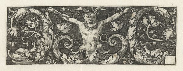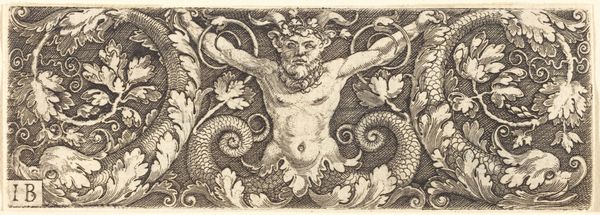 Curator: Welcome. We’re looking at a print by Theodor de Bry, made between 1585 and 1595. It’s called "Frieze with a Bearded Mask Wearing a Headdress of Tendrils and Strapwork," and it is now housed at the Metropolitan Museum of Art. Editor: My first impression is a sense of organized chaos! The composition is densely packed with meticulously rendered details. The balance between organic forms, like the flowers and animals, and the rigid geometry of the strapwork is intriguing. Curator: Indeed. De Bry was a master of ornament, and this piece exemplifies the Mannerist style. These kinds of prints were not just art objects, but served as models for artisans – goldsmiths, engravers, and so on – providing a visual vocabulary for decoration. Editor: Looking closer, the precision of the line work is striking. See how the varying thickness creates depth and shadow, even in this monochrome palette? And that central mask—there's a real dynamism in the contrast of his stoic face and the riot of vegetation sprouting from his head. Curator: Precisely! That bearded mask embodies the grotesque, a popular motif during the Renaissance and Mannerist periods, playing with the boundaries between the human and the natural. Consider the cultural context; this print reflects the era’s fascination with collecting and classifying the natural world, which can be seen through the botanically accurate flower. Editor: It also makes me think about semiotics and meaning making through visual language. The animals – squirrels and rabbits—and even the placement of vases could potentially represent wealth and domesticity within the 16th century context. Curator: And more broadly, ornament such as this helped create elite material culture. Objects decorated with these motifs communicated social status, trade connections, and religious affiliations to a wide public. Editor: I appreciate how this analysis enhances the work. When viewed solely based on aesthetic principles, the engraving showcases masterful handling of line and form. Now, seeing this artwork as more of a cultural document adds greater insight to its composition. Curator: Exactly. Considering its historical and social role helps reveal layers of meaning and functionality, and in understanding it we can recognize it as something beyond just decoration. Editor: Thank you for enriching our observation today. The blending of art and social history provides a depth and texture that goes beyond first impressions.