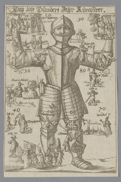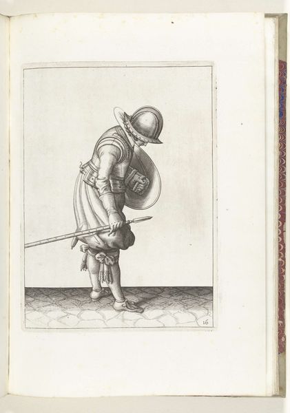 Curator: Here we have a woodcut print dating circa 1545, created by Monogrammist I.K., and aptly titled, "German Soldier Standing with Flag." I find the texture created by the medium, especially in the figure's garments, quite remarkable. Editor: It does possess a rather bold graphic quality. But the soldier himself… he’s somewhat weighed down, almost apologetic. His stance lacks triumphant energy. I wonder what that says about the iconography of power here. Curator: Consider the labor involved in producing such an image, particularly at that time. Woodcuts demanded skilled artisans to carve the designs into wooden blocks, a laborious task. And printing, even simple black-and-white prints like this, required considerable time and material resources. Editor: True, but that flag held aloft seems more of a burden than a banner of victory. The castle looming in the background, along with the man's stern facial expression… It could symbolize something beyond military might, perhaps the weight of responsibility, or even anxiety regarding the Holy Roman Empire? Curator: That tension between craft and message is compelling. The controlled lines contrast with the grandeur typically associated with depictions of soldiers. Were these prints circulated widely? Were they aimed at bolstering morale, or did they perhaps capture some existing doubt among the populace? Editor: It’s worth looking at how flags were treated generally in similar depictions from this period. What’s unique here? Flags are devices not just to show allegiance, but to unite symbolically. This feels more individual and pensive. Almost mournful, really. Curator: The level of detail in the soldier's clothing does strike me; all those meticulous X’s along his sleeves and legs... It would have taken painstaking effort to cut away the surrounding wood. Each material decision would suggest specific societal pressures related to luxury and the demands of artistic production in sixteenth-century Europe. Editor: Looking closely, you see the ground isn't smooth either, but uneven. To me it introduces an element of vulnerability and instability. It all points to a rather poignant statement on military life and perhaps even duty, which seems quite novel for this type of artwork. Curator: This image reveals the interplay between manual labor and intended message so distinctly, that it is quite unique. It truly emphasizes both the economic factors of its creation, and the personal statement within its lines. Editor: Yes, this piece urges us to remember that, beyond grand symbols, lie complex personal and societal sentiments—a thoughtful perspective offered in this singular print.