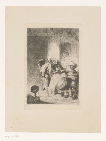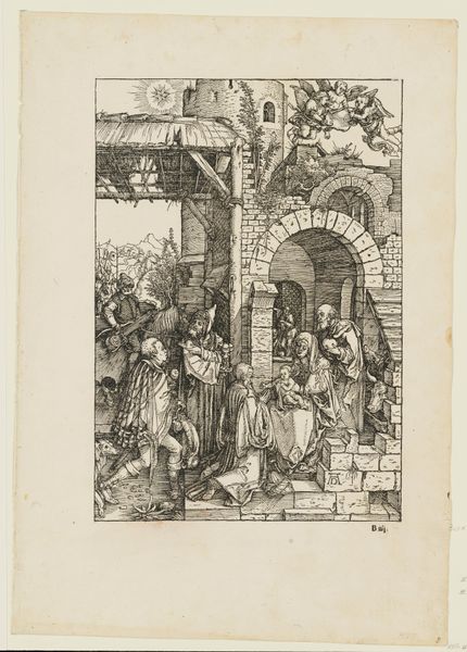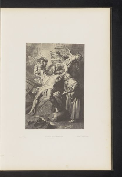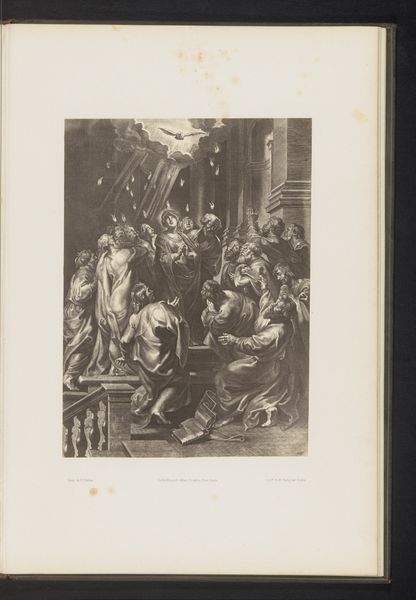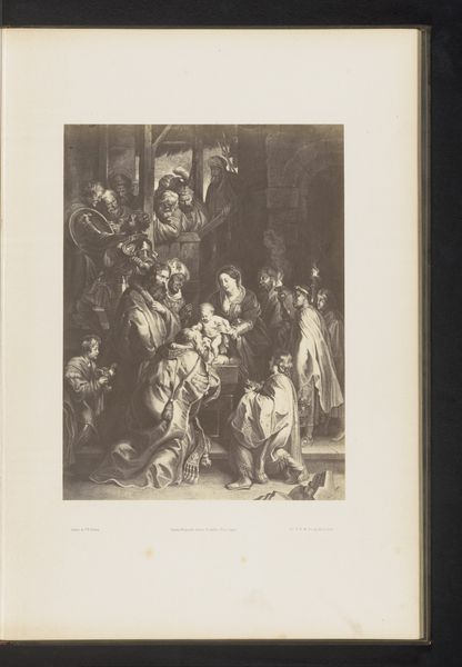 Editor: This engraving by Frans van Kuyck, possibly from 1894-1895, is titled "Reproductie van een tekening van twee muzikanten in Oud-Antwerpen op de Wereldtentoonstelling van 1894 in Antwerpen." It depicts musicians in historical garb. There’s a crucifix, a small crowd, and a theatrical quality to the scene that makes me wonder about its symbolism. What do you see when you look at this print? Curator: I see a complex layering of historical representation. We have a reproduction of a drawing depicting a historical scene of musicians, presented at the World's Fair, a celebration of modernity. Note the medieval clothing contrasted by what seems like a critical eye from the assembly in the foreground, their postures guarded, reserved, with some holding instruments also. What message do you think this World Fair was broadcasting by putting pre-modernity on display? Editor: That's a great point about the layers of history! I suppose it was about positioning the present as superior to the past. The careful recordkeeping of history on show, even music. Did Van Kuyck's image then confirm these themes? Curator: In part, yes, but perhaps also subtly challenged it. Look at the central position of the crucifix; it's not just background scenery. It is towering over everything as something ever present. Also, the musicians depicted aren't just playing; their posture, almost on pedestals, evokes a sense of defiance or resilience despite their apparent historical remove. What does that visual tension tell you? Editor: It’s like a ghost story, told by both, or maybe more appropriately it evokes a conversation with history that even technological advancements cannot silence! Curator: Precisely! Van Kuyck invites us to consider the enduring power of cultural memory and the way symbols resonate across time, not just something relegated to the past but continually alive in the present. It gives one quite a lot to reflect on, wouldn't you say? Editor: Absolutely. It shows how history, art, and cultural identity are always being re-negotiated and represented through imagery. Thanks so much for sharing your perspective!