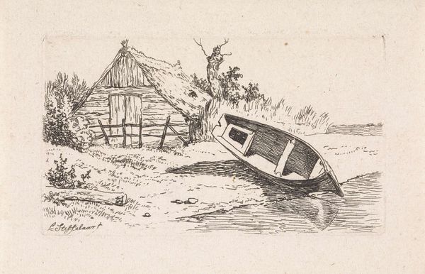 Curator: Let’s discuss Adrianus Eversen’s, View of a Boathouse, thought to have been made somewhere between 1828 and 1897. The artwork combines watercolor and charcoal drawing. Editor: It's subdued, isn’t it? Almost monochromatic. The limited palette really emphasizes the textural details of the boathouse and the surrounding water. It projects a certain...stillness. Curator: Yes, Eversen's choice of materials, watercolor and charcoal, allowed for the swift depiction of light and form; these were relatively inexpensive media. Note the drawing’s implications regarding labor and leisure, and the social context it evokes. This contrasts, shall we say, with the opulence often associated with the fine arts of his period. Editor: The composition guides the eye nicely; the dark tones of the boathouse against the faded grays of what’s beyond—skiffs, sailing masts, the distant city buildings, including what appears to be a domed cathedral. Look at the texture—charcoal blended subtly on that central structure, versus the crisp detail used to portray the grasses in the lower left. Curator: Consider also that Eversen, whilst alive during an age of vast material development, turns to depict an aging boathouse rather than one that is modern or innovative. The boathouse—it has a sort of dilapidated, improvised nature to it. The building has been made through labour, yet we do not see that labor praised by modern society—but rather ignored and left to slowly decline. Editor: I’m interested in how the light is used not for pure naturalism, but perhaps to evoke mood. The light here models form and highlights surfaces in ways that encourage contemplation. What do you make of the semiotic impact? I'm wondering what interpretations it might offer regarding urban existence... Curator: This artistic choice presents us with interesting socio-economic perspectives as the rise of mass consumption increasingly occurred within Europe. We are compelled to appreciate these elements from a humble worker perspective. Editor: So, what emerges is a tension between the detailed, textural surfaces of working life with implications of mortality; this is contrasted against the artist’s technical precision of blending and contour. It’s quite compelling, and has prompted some exciting discussion! Curator: Indeed. Reflecting on it further, I value how the process illuminates Eversen’s worldview.