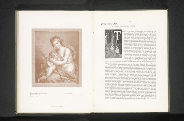 Curator: I find this reproduction intriguing. This printed image of a photograph of Jean-Joseph Jaquet’s "L'Age d'Or," or “The Golden Age," was created in 1854, a period where photography itself was grappling with its place in art. Editor: It’s an affecting image, certainly, with the soft gradations of light on what appears to be a classical sculpture. It has the look of well-handled chiaroscuro, with a concentration on form, and an attempt at imbuing the sculptural subjects with… tenderness? Curator: The very title implies an idealized past, an echo of a time of innocence and plenty often associated with the origins of humanity. This sculpture speaks to the 19th century's fascination with revisiting and reimagining classical themes within a rapidly changing industrial society. It offers an escape, a romanticized contrast. Editor: I notice that it’s a photograph *of* a sculpture, isn't it? The original sculptural form would have been carefully composed and carved. And the black and white printing highlights the forms beautifully. What is gained and lost, do you think, when the work is mediated through both sculpture and photograph, ending with printing? Curator: That mediation you point out highlights the anxieties about the place of photography. The sculpture becomes reproducible, accessible. This challenges the elitist view of art and potentially democratizes access to such allegorical subjects as The Golden Age. Remember too, 1854 was in the midst of immense political changes in France, and elsewhere in Europe! Editor: The image has an ethereal feel to it; its focus on the tonal shifts creates a rather strong sense of idealized form, even perfection. But I suppose such feelings were crucial to upholding traditional values when societies confront technological advancements, yes? Curator: Precisely! The photograph as a medium here doesn’t only copy the sculpture; it takes on a role in negotiating societal beliefs around historical memory and idealizing aesthetics of art through technological advance. Editor: Yes, seeing the piece this way definitely illuminates how social context interacts with artistic production to inform broader cultural values. Curator: And for me, it shows how the technology changed accessibility to culture more broadly, changing both viewership and its meaning.