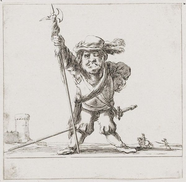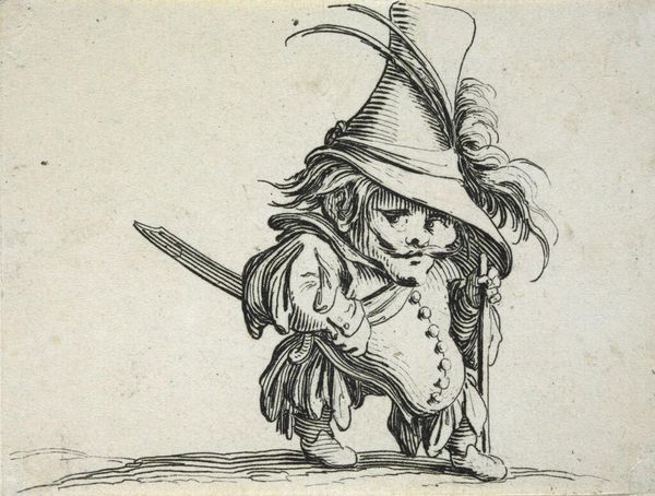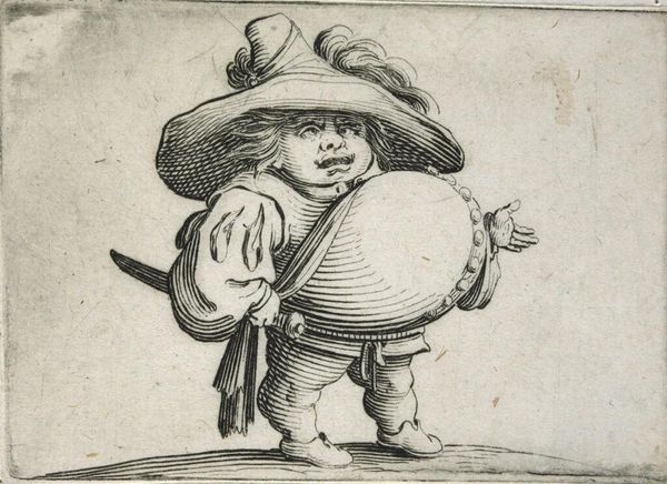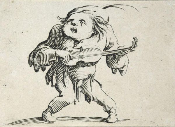 Curator: This is Jacques Callot's etching, "Violinist." Note the dimensions, just 6.5 by 8.8 centimeters. Editor: There's something unsettling about the figure—the eyes are wild, and the physique is so grotesquely proportioned. Curator: Yes, the artist's rendering is achieved through a remarkable use of line. The hatching and cross-hatching define the form and create volume, don't you think? Editor: I do, but I'm also struck by the symbolism of the musician himself. In folklore, the violin is often tied to trickery or even the devil. Curator: An interesting interpretation. However, I see the violin more as a focal point, a study of shape and texture. Editor: Still, one can't ignore the exaggerated features. The figure seems to embody both the comical and the sinister. Curator: Agreed, Callot uses distortion masterfully to create tension within the image. Editor: In any case, this piece has given me food for thought. Curator: Indeed, a small piece with a lot to say.