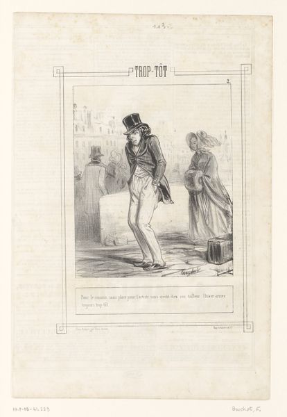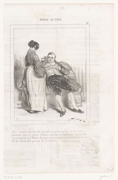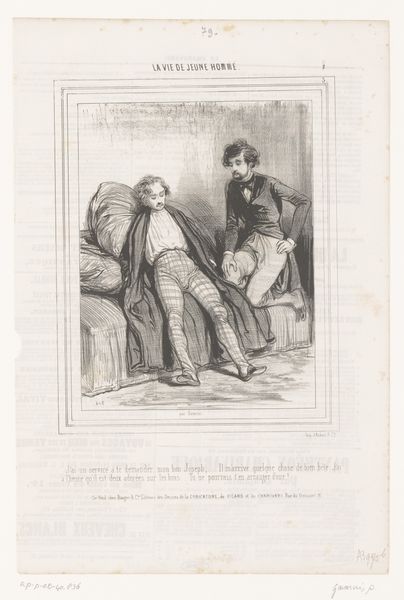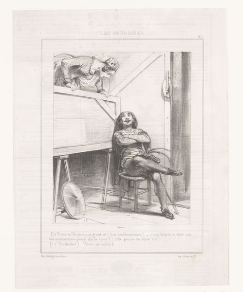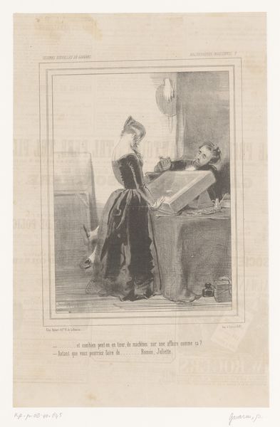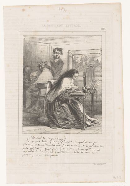 Editor: This is "Man reading a letter over the shoulder of his sleeping girlfriend," a lithograph from 1846 by Edouard de Beaumont. The mood is quite intimate, almost voyeuristic, but there's something uncomfortable about the man's posture, hovering over the woman like that. How do you interpret this work? Curator: The tension you feel is key. While seemingly a simple genre scene, we need to unpack the power dynamics. Consider the title, "Les Folies Femmes de Paris" - The Follies of Parisian Women - immediately framing the woman's actions, and perhaps even her slumber, as a "folly". It invites us to consider this image within a broader societal critique of women's roles and representation in 19th-century Paris. Editor: I see what you mean. It's like he's taking control of her narrative while she's literally powerless, asleep and unaware. Curator: Exactly. The text underneath the image heightens this. She's writing a letter to "Casimir," and starts it with "Philemon." There are suggestions of romantic entanglement, of perceived betrayal, perhaps of even a societal trap. It speaks volumes about the limited agency women held in that era. Beaumont encourages us to reflect on who has the power to tell the story and whose perspective we’re seeing it from. Editor: So it's not just a portrait; it's a social commentary on the female experience, framed by male dominance? Curator: Precisely. The artwork embodies tensions regarding societal expectations of women, male voyeurism and the gaze. Through art like this we examine the seeds of the inequities we’re still grappling with. Editor: It makes me rethink my initial impression of intimacy; the scene isn't tender, it’s controlling. I appreciate the reminder to analyze an artwork through the lens of social and political contexts of the time. Curator: And conversely, by seeing historical artwork in this manner, it is hard not to ponder current social and political struggles.
