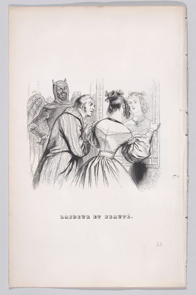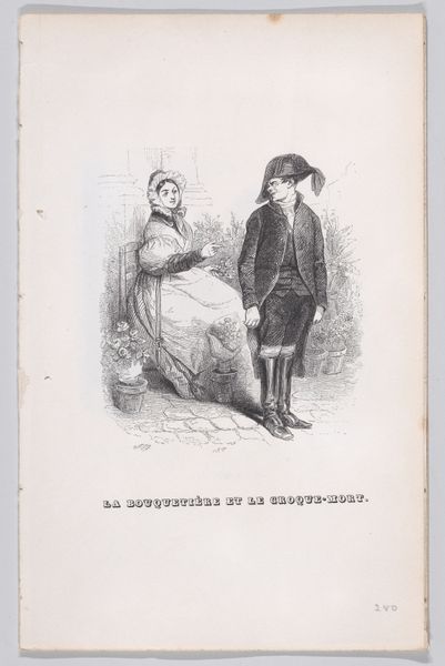 J.J. Grandville made this lithograph, "The Hunter and the Milkmaid," as an illustration for a collection of songs by the popular French poet Béranger. Born just after the French Revolution, Béranger's writing reflected the social unrest and political upheaval of 19th century France. This image presents a staged encounter between a hunter and a milkmaid, archetypes representing different strata of society. The hunter, with his rifle and dog, leans casually against a fence, while the milkmaid, burdened with her working clothes and gaze averted, seems less at ease. It highlights the gendered expectations of the time, where women were often confined to domestic roles. The scene is rendered with a delicate touch, but look closely and you will see the tensions and subtle power dynamics at play. In his work, Grandville excelled at caricatures, using them to critique the foibles of human nature and the injustices of society. This print reflects the personal and collective emotional experiences of a society in flux, inviting us to reflect on the ever-evolving narratives of identity, gender, and class.