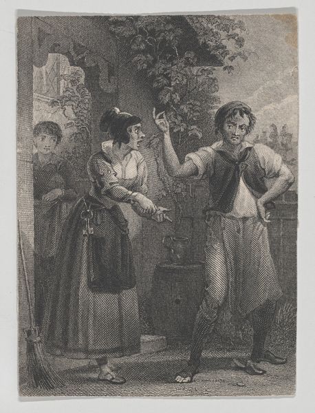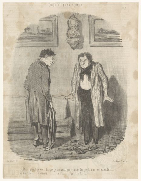 Editor: So, this lithograph from 1843, "Caricature of a Member of Parliament Visiting Constituents," by Honoré Daumier… I can’t help but chuckle. It feels so pointed. Everyone looks slightly ridiculous, especially that handshake. What’s your take on this scene? Curator: Ah, Daumier! A master of capturing the human comedy. What I see here is a politician, sleek and smarmy, clasping hands with the working class – note the surroundings! – during a visit. But it's not just observation; Daumier is dissecting society with that pencil of his. It is more than the scene, isn't it? How does Daumier, that clever scoundrel, make us feel about that stiff handshake? Editor: I think it's brilliant, how he uses exaggeration, right? Like, the politician's almost too eager, while the others seem… wary. Are those really barrels stacked up on the wall behind? Or are they storage boxes? I think barrels. Curator: Exactly! The hyper-expressive features and distorted figures make it clear – this isn't just a portrait. It's a social commentary served with wit. And look, if those are barrels in a shop, what do they *really* represent? A barrel is round and rolls easily! The system isn't fixed! And, Daumier lived through some pretty turbulent times, you know. Editor: Revolution times! So this drawing reflects the tension of the time, then. This print becomes a way for the artist to participate and reveal. Curator: Precisely! Each line serves the greater purpose of a commentary and serves the bigger picture, no pun intended. And to bring the idea full-circle, lithographs are a medium of the people, right? It's meant for distribution to all social classes! It would spread like wildfire! Editor: It’s like visual journalism, only with a sharp, satirical edge! I totally get what you mean. So, a simple handshake becomes a loaded symbol, right? The lithography enabled the social distribution. Curator: Precisely! The image's genius lies in the immediacy, the clear message and the ease by which Daumier made the drawing available for widespread interpretation. A vote for parliament is in their hands! But is this parliamentarian trustworthy? Daumier leaves you questioning it with that loaded handshake. Editor: I love that idea of 'visual journalism!' I will always remember the context around this now. Thank you! Curator: A genuine pleasure. Perhaps, now, we're both slightly better equipped to discern the politician at our front doors, as well?