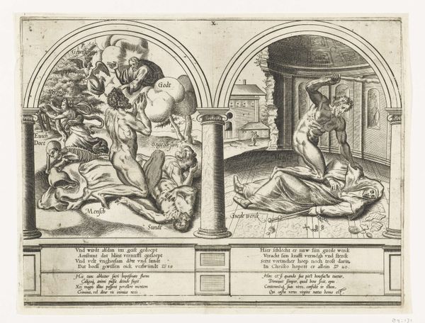 Curator: This engraving, serving as the title page for the “Hollandsche Mercurius” of 1687, was created by Romeyn de Hooghe in 1688. Editor: It's striking how much is crammed into this relatively small print. It feels dense, almost chaotic, with figures layered upon each other. Curator: Indeed, the composition reflects a distinct baroque sensibility, wouldn't you say? The eye is immediately drawn to the allegorical figures above – Pallas Athena standing triumphantly. Observe the exquisite details in her drapery, the rendering of light and shadow which defines her presence. Editor: Of course, one can’t ignore how those figures, though classically rendered, serve a very specific political function. Athena bestowing a crown certainly speaks to power and legitimization. Is there perhaps an intent to idealize and validate existing power structures through the guise of historical allegory? Curator: The upper register utilizes classical symbolism. The lower part seems to depict more contemporary turmoil and human drama, though. It certainly contributes to the print's dynamic energy. Note how the artist uses hatching to define form. It serves both descriptive and expressive purposes. Editor: What strikes me is how the depiction of contemporary subjects often overlooks historical oppressions and injustices. These representations of conflict frequently reinforce the narratives of the victors, silencing marginalized voices within those struggles. Curator: From a formal point of view, the use of contrasting visual registers within a single frame does achieve a visually striking composition, and it enhances the reading of the narrative, which wouldn’t be the same if the scenes were compartmentalized, for instance. Editor: Yes, but the artist must always reckon with the power of their artistic choices to reflect—or indeed, refract—the social realities from which they are derived. This kind of historical contextualization forces us to examine what histories get remembered, and how. Curator: Perhaps through these divergent interpretations, we can gain a fuller sense of the intricate visual construction Romeyn de Hooghe has offered. Editor: Agreed. And a broader sense of how artworks, regardless of medium, interact within complex socio-historical dialogues.