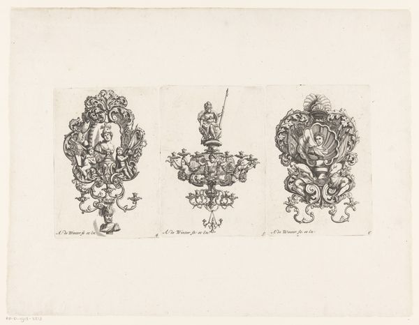 Curator: Ah, yes, "Six designs set in medallions", a drawing made with etching from sometime between 1850 and 1900. The artist is Jules-Edmond-Charles Lachaise. Editor: Immediately I think of something lifted from a very ornate calling card! There’s something delicate and a little… preposterous about the compositions. Like tiny, baroque secrets. Curator: Considering its likely original function as part of a decorative arts design portfolio, it makes sense. Think about the labour invested here. Each medallion is a distinct object that also is a repeatable pattern which means it's perfect for mass production. Editor: It’s fascinating how readily we assume these were intended for mass production, as you say. Perhaps Lachaise had more personal, handcrafted applications in mind? I find myself pondering the stories these tiny medallions might conceal. Each symbol, each flourish must whisper something specific... like a visual poem. Curator: We can appreciate its visual complexity and the delicate etching, of course. However, these medallions can also be a record of the artistic labour and technical skill that the artist or the craftsman would use to earn a livelihood during the Industrial Revolution when consumer culture exploded. Editor: A record! Precisely! And perhaps a kind of intimate rebellion? An assertion of the personal amid the growing mechanization. Each swirl and meticulously etched detail… a declaration of humanity! Am I reading too much into it? Curator: Well, maybe a bit too much, although such interpretations of art are crucial as they invite conversation. Let's not disregard the power of creative freedom under economic restraint. Art is always connected with its historical situation. Editor: Perhaps I'm too eager to unearth profound statements, to force an artist's intention onto things, when sometimes a calling card is just a calling card. However, I won’t deny it inspires daydreams! Curator: Which in the end contributes to cultural meaning. A pretty nice etching overall, by the way, I am happy to have been able to provide you with the necessary information. Editor: Indeed. I'm glad to let the images resonate with new ideas, however fanciful. Thanks!