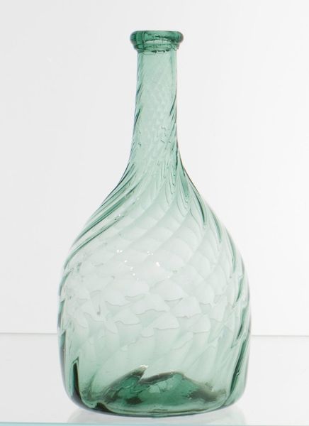 Curator: This is a “Chestnut Flask”, created around the 19th century and currently held here at the Minneapolis Institute of Art. The piece is an example of glass photography from the United States. Editor: Wow, a translucent dream in avocado green! I’m immediately drawn to the play of light within the glass. It’s like holding a captured breath. Curator: These chestnut flasks became incredibly popular as decorative items and functional containers, finding a place in many homes throughout the United States. Their presence highlights the accessibility of artistry within society during the era, transforming daily routines into opportunities for aesthetic consideration. Editor: Absolutely, you can see it! It’s got this folksy, almost playful quality about it, even with the precise diamond patterning across the bulb. It feels handcrafted and accessible. Did they actually carry chestnuts, or was it just the form? Curator: While they could indeed be used to carry chestnuts, the "chestnut" moniker mostly refers to the shape, inspired by the seed. Glassblowing techniques made pieces like these comparatively inexpensive. Editor: It gives a sense of bringing nature indoors, right? Imagine how lively its hue would turn in the sun! Makes you reconsider how glass could be both everyday and deeply connected to a craft aesthetic. Curator: I agree, and from a material history angle, it represents a time when manufactured items, were consciously trying to blend functionality with the desire for beauty in everyday objects. That green hue, achieved by adding certain elements, reflects trends in design popular in the late 1800s. Editor: Exactly. Considering its context, this little green beauty feels a little more than just decoration—it's holding secrets about a moment, isn’t it? A connection to form and artistry! Curator: Precisely. It’s remarkable how this single piece allows us to perceive echoes of artistic movements, everyday habits, and manufacturing innovation, all tied together through culture. Editor: It is so cool! Something as simple as a glass flask is still so powerful at unlocking imagination, revealing historical context and maybe inspire someone artistically.