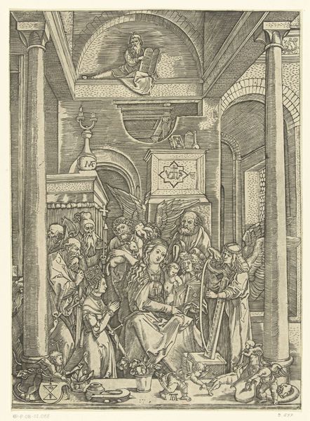 Editor: Here we have Albrecht Dürer's "The Glorification of the Virgin," a woodcut print from around 1502, part of his "Life of the Virgin" series. I find the intricate lines create such a detailed and almost dreamlike vision. What cultural symbolism strikes you most prominently in this piece? Curator: The overwhelming sensation I receive comes from observing the sacred space which Dürer builds for the narrative. Look at the architectural components and the use of vertical lines which convey a hallowed location, juxtaposed with images such as cherubs surrounding The Virgin, a classic representation, but note the expressions and emotions expressed in each face and body, from child to adult. This invokes contemplation in the viewer on religious beliefs. Editor: That’s a great point. I hadn't really thought about the setting adding to the image’s narrative. I was so focused on the Madonna and Child figures. It seems Dürer is merging the celestial with the tangible world? Curator: Precisely. Consider how the architecture itself – the columns, arches, even the angel up high – acts as a symbolic bridge. What emotions does the image try to project, what memories does it pull up? Look at how the eyes connect between figures and see if it prompts an emotion from yourself. Editor: It's amazing how much information Dürer conveys just through the arrangement and depiction of figures. The expressions hold a great deal of weight. Is this kind of intense figuration typical of Northern Renaissance art? Curator: The Northern Renaissance, particularly through printmaking, frequently emphasized accessible symbolism that would be recognisable at the time by everyday citizens. They may have gained understanding of certain symbolism over years of religious education. The density is definitely part of it. This work can serve as a meditative visual. What new observations might surface each time we engage with the work? Editor: It does feel like something to meditate on! I’ll certainly look at Dürer's work with new eyes, focusing on those symbols and their connections to both the sacred and the everyday. Curator: Agreed! Symbols and their relationship with cultural memory provides more context the deeper you analyze and examine the history.