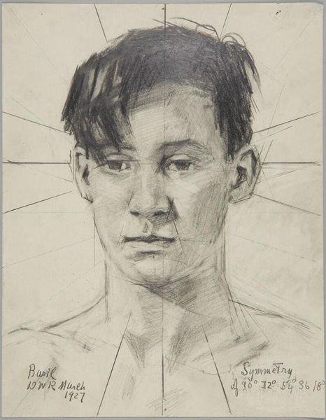 Editor: Here we have Denman Waldo Ross's sketch, "Soren Kroygaard Ostergaard". It feels like a study, with all the geometric lines overlaying the portrait. What strikes you about this piece? Curator: It is intriguing how Ross combines portraiture with mathematical precision. The inscription "Angles of the Pentagon" suggests an interest in ideal proportions. Consider how the early 20th century saw a surge in applying scientific principles to art, aiming for objective beauty. Editor: So, it's not just a portrait, but an exploration of ideal form? Curator: Precisely. It reflects a desire to find universal rules for aesthetics, mirroring the era's fascination with order and rationality. What do you make of the subject's expression? Editor: He seems quite neutral, almost clinical, which fits the analytical feel. It makes me wonder how the subject himself felt about being part of this experiment. Curator: That's an excellent point. The personal and the systematic intersect here, raising questions about the artist's and subject's roles within this historical moment. Editor: I never thought about the social aspect of aesthetic theories. Thanks for pointing that out. Curator: My pleasure. Art is always embedded in a specific time and place, shaped by prevailing ideas and social dynamics.