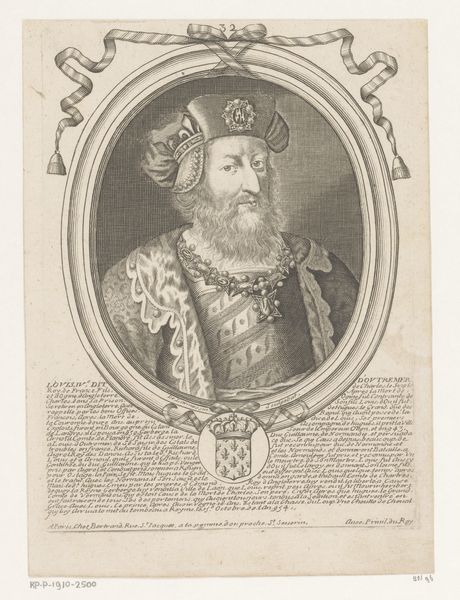 Editor: So, this is "Portret van Hendrik II, koning van Frankrijk" by Nicolas de Larmessin I, made sometime between 1642 and 1678. It's currently at the Rijksmuseum. It’s an engraving, isn't it? It’s interesting to see this detailed portrait rendered with what looks like very precise lines. How do you see this piece, especially knowing it's a print? Curator: Well, immediately my attention is drawn to the means of production. This isn't some spontaneous painting; it's a meticulously crafted print. Consider the labor involved: the engraver, the printing press, the paper, and its distribution. How does that industrialization impact how we perceive the royal figure depicted? Editor: That’s a perspective I hadn’t considered! It makes me think about the intention behind making it a print. Was it about mass production, to spread the image of the king? Curator: Precisely. The choice of engraving signifies broader distribution. Portraits were often vehicles of power, but turning it into a print transformed the portrait into a commodity. The image becomes available for consumption. Who was the target audience, and how might their social class or political affiliations shaped their reception? Editor: So it’s not just about the king’s image, but how accessible that image was to the people and the social implications of its accessibility? I never really considered art through the lens of consumption like that. Curator: Absolutely. Think about the materials themselves. Where did the copper come from? Who mined it? This piece provides a window into global trade networks and the systems of labor underpinning artistic creation. Even something seemingly high-brow is connected to raw materials and labour. Editor: Wow, okay. I definitely see the portrait in a totally different light now. It's no longer just about aesthetics, it's about a network of processes, labour and consumption. Curator: Exactly! It makes us consider the political economy of image-making. The focus on materiality is key to deconstructing art.
