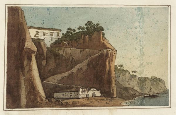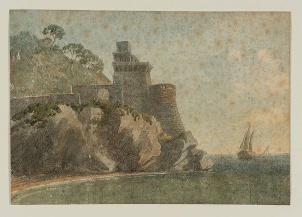 Editor: So, this is "A Convent at Surrentum" by John 'Warwick' Smith. It's a watercolor. The setting has a kind of quiet beauty, but there’s also something about the convent perched on that cliff that feels…isolated. What do you see in this piece? Curator: I see a loaded representation of power and enclosure. Consider the convent's architecture—stark, imposing—contrasted against the 'picturesque' landscape. Who is being excluded? What narratives of gender and class are being reinforced by this framing of religious life against the backdrop of the Italian landscape? Editor: That's not something I would have considered. Thank you. Curator: Of course. Examining these power dynamics helps us understand the complex ways art can both reflect and shape our perceptions.