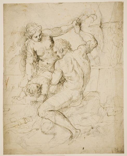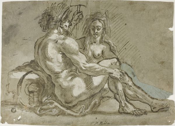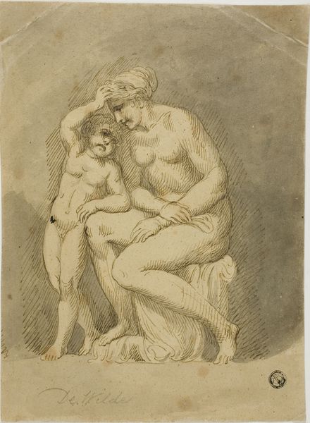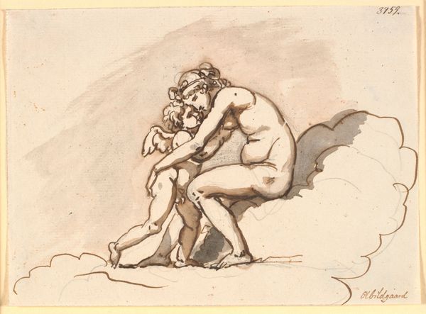 Curator: This is Nicolai Abildgaard’s “En nøgen knælende moder med sin lille dreng,” dating roughly from 1743 to 1809. It’s a drawing, using ink and watercolor, held in the collection of the SMK - Statens Museum for Kunst. Editor: The composition is striking—a mother and child, both nude, intertwined in an intimate embrace. The sketchy lines convey a sense of immediacy, almost as if capturing a fleeting moment. There's a tenderness despite the lack of fine detail. Curator: Indeed. Considering Abildgaard’s historical context, let's examine his materials and their role. The use of ink and watercolor, readily available and relatively inexpensive, suggests this work might have been conceived as a study rather than a finished piece for formal commission. This connects to a broader Romantic interest in capturing raw emotion and primal connections. Editor: Focusing on formal elements, observe how the artist employs contour lines to define the figures, especially the mother’s muscular physique, which is contrasted with the soft curves of the child. The subtle washes of color add volume and depth, directing our gaze towards their embrace—a very classical arrangement. Curator: The sketch's medium underscores the labor. It is visible, evident that the artist is workshopping how the mother and child physically fit together. This speaks to Abildgaard's role in shaping Danish national identity through accessible depictions of universal familial bonds, making art relevant beyond courtly circles. Editor: I see it more in terms of formal tensions: the dynamism of the pose against the static quality of the ground. The contrasting line weights create a compelling interplay of light and shadow, which accentuates their forms. Notice the subtle psychological tension, the inward focus suggested by their downcast glances, indicative of burgeoning Romantic sentiments. Curator: That's where labor comes in; that emotionality is something worked and developed, something crafted, not merely an inspiration. Abildgaard and others labored to connect art and identity. The increasing commodification of art fostered new markets where sketches carried both artistic merit and symbolic cultural weight. Editor: A valuable insight into the context of its creation. By considering both formal devices and art's sociopolitical environment, we gain a more layered appreciation. Curator: I concur. By recognizing art's production methods and its availability, we contextualize the artwork and comprehend the material circumstances that propelled his creativity.