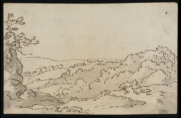 Curator: Philip James De Loutherbourg's "View across Fields to a Broad Estuary" presents a landscape sketch rendered with pen on paper. The artwork dimensions are fairly modest, about 80 by 120 millimeters. Editor: It feels so airy, doesn't it? All those delicate lines hinting at the scene, a lightness of touch that evokes open space and distant horizons. Curator: Indeed. The material process is quite straightforward, yet the result speaks to De Loutherbourg's keen understanding of composition and perspective, even at this small scale. Editor: Almost like a memory captured on paper. A fleeting moment, sketched quickly, but full of a tranquil beauty that stays with you. I like this one. Curator: Considering its simplicity, the sketch reveals how a rudimentary medium like pen and paper can still convey spatial depth and atmospheric perspective effectively. Editor: Exactly, it's less about the perfect rendering and more about capturing the soul of a place. Makes you wonder about the other landscapes he saw. Curator: Precisely, and the material limitations possibly shaped his creative choices here. It would have been interesting to see what he could have done with something like oils. Editor: True! It’s wonderful to consider how that intention and physical output interact, isn’t it?