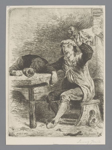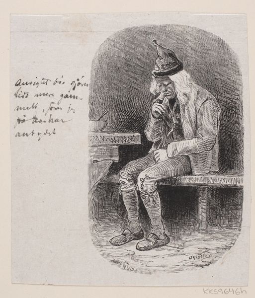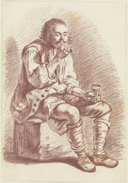 This print, titled "En Mand tænder sin Pipe," of unknown date, was created by an anonymous artist using etching techniques. The dense network of etched lines captures a man lighting his pipe, seated against what seems to be a brick fireplace. Notice how the fineness of the etched lines allows for subtle tonal variations, which in turn give depth and texture to the figure's clothes, weathered face, and the rough masonry behind him. Etching involves coating a metal plate with a waxy, acid-resistant substance, then drawing through this layer to expose the metal. When the plate is immersed in acid, lines are bitten into the metal where exposed. The plate is then inked and printed, resulting in the image we see. This process, while less direct than drawing, allows for the creation of multiples, democratizing art. The very nature of printmaking is tied to notions of labor, production, and consumption, echoing the everyday life of the man depicted. Ultimately, appreciating this print means understanding the intimate relationship between material, process, and the social realities it reflects. It challenges us to look beyond the image and recognize the labor and context embedded within its creation.