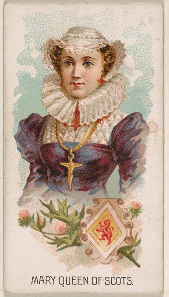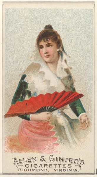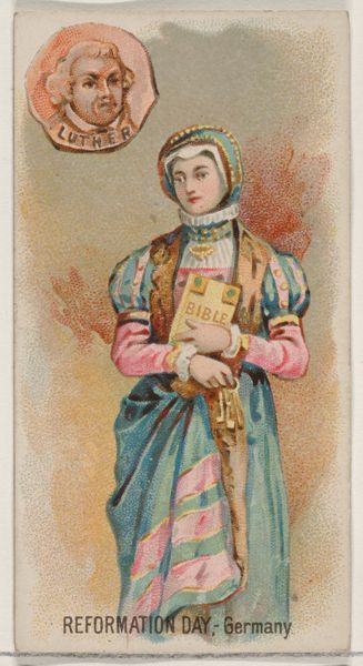 This is "Heralds Trumpet" from the Musical Instruments series of trade cards produced by W. Duke, Sons & Co. The image presents a figure adorned in a costume of patterned heraldry, split vertically into two distinct fields. One side features a field of blue with white fleur-de-lis motifs, while the other displays red lions passant on a white ground, all meticulously rendered to capture the eye within this small format. Note how the artist uses the heraldic symbols and contrasting colours not merely as decoration but as a structured system. This is a semiotic language. The patterns evoke tradition and status. The herald's role as a communicator is highlighted by the trumpet and banner that accompany the figure, turning the image into a complex sign. Consider how such a commercial image taps into cultural codes of heraldry and musical tradition, transforming them into a message of brand recognition and aspiration. The image's structural arrangement encourages us to decode its multiple layers of meaning.