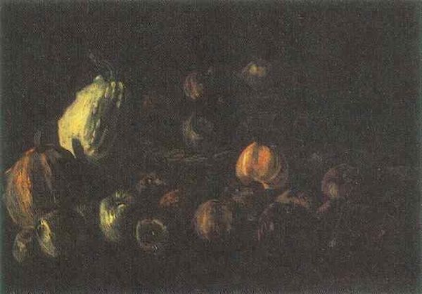 Editor: Here we have Van Gogh’s “Still Life with an Earthen Bowl and Pears," painted in 1885 using oil on canvas. It feels so…earthy. Almost like I can smell the damp soil. What draws your eye in this piece? Curator: Isn't it fascinating how Van Gogh transforms the ordinary? For me, it’s the contrast. The pears themselves, rendered with such…well, roughness, sitting in that almost elegant, classically shaped bowl. It’s a visual poem about finding beauty in simplicity, even in the mundane. What do you make of the color palette, or lack thereof, if you will? Editor: It’s undeniably dark, somber almost. Not what I typically associate with still lifes, which tend to be so vibrant and full of life. Was he making some kind of statement? Curator: Perhaps. Remember, Van Gogh was in a particularly…turbulent period. He was in Nuenen, surrounded by poverty and the lives of peasant farmers. These pears weren't just fruit, were they? I think they represented the simple, honest realities of life for him, you know? The bowl, maybe, his aspirations towards beauty, perpetually grounded by harsh realities. Editor: That’s a poignant way to look at it. So, he's not just painting fruit, he's painting… life. Curator: Exactly. He captures the heart, right? Even if it is tinged with shadow. Editor: I always looked at this painting as dark, but it seems Van Gogh was pointing to life and hope through hardship, in his own unique way. Curator: And maybe that’s the best still life of all, because without a subject or person we still see an entire story in paint.