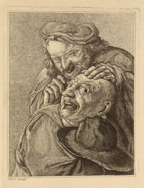 This is an anonymous print titled "Keisnijder (het Gevoel)." The stark monochromatic palette immediately draws us into a world of intense sensation. We see two figures closely cropped, one hunched over the other. The upper figure, presumably the "keisnijder" or stone cutter, is extracting something from the head of his patient. Observe how the artist uses contrasting textures to heighten the drama. The stone cutter’s face is etched with fine lines, a mask of concentration. In contrast, the patient’s face is contorted, his mouth agape and eyes bulging. The composition is carefully structured to maximize the tension between the two figures. The stone cutter’s hands frame the patient’s head, almost as if he is the surgeon manipulating the subject. The print invites us to think about the nature of pain, perception, and perhaps even the act of artistic creation itself. Art here becomes a form of surgery, cutting away at the surface to reveal something deeper. The print remains a compelling exploration into the material and metaphorical dimensions of human experience.