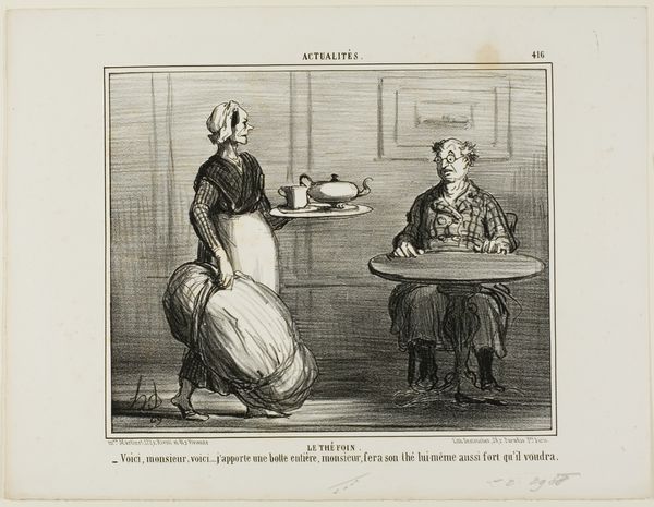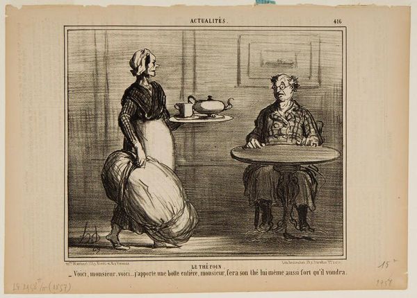 Editor: This is Honoré Daumier's "A Banquet for Horsemeat Eaters." It looks like a lithograph. It seems to convey a sardonic mood. The facial expressions are striking! What compositional elements stand out to you? Curator: Note how Daumier uses line and shadow to sculpt form. The figures are rendered with a remarkable economy of means. The hatching technique creates depth and texture, and notice how the composition is essentially a pyramidal structure, grounding the visual narrative. How does that formal choice speak to the work as a whole? Editor: I see what you mean! It brings the eye to the horse's head. It emphasizes the subject of the work. Curator: Precisely! The textures of the horse's head and the cook's attire each contribute to a study of contrasts, don't they? Editor: I hadn't noticed that before! Thank you. Curator: Of course.