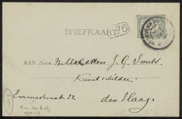 Editor: Here we have Carel Nicolaas Storm van 's-Gravesande's "Briefkaart aan Philip Zilcken," made before 1911. It’s ink on paper – a humble postcard. It feels so delicate, almost ephemeral. What can you tell me about it? Curator: This unassuming object holds within it a whispered conversation, doesn't it? It speaks to a time when correspondence was tangible, when a few carefully chosen words carried across a city held a particular weight. Do you notice the calligraphy itself? How it seems to dance across the card, reflecting perhaps, the personality of the sender? I can almost feel the hand that wrote this! Editor: It does have such graceful curves! And the stamps are such lovely, intricate details. But why save something so simple? What makes it worthy of being in a museum? Curator: Ah, but is it simple, really? It offers a glimpse into the social circles of artists and intellectuals of the time, a miniature portrait of an era. Philip Zilcken was himself an artist, so this card hints at artistic exchange, perhaps even collaboration. The Rijksmuseum holds it as an intimate, revealing artifact. The postmarks and the address scrawled in elegant script tells us more about this moment and its actors. Isn’t it strange how a humble postcard can reveal so much about a particular slice of history? Editor: I see what you mean! I guess I was looking for something monumental, but sometimes the small things whisper the loudest. Thanks so much! Curator: And thank *you*! You've reminded me that art, in all its forms, is a vessel for human connection. It truly is about opening our ears to those whispers.