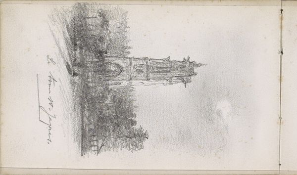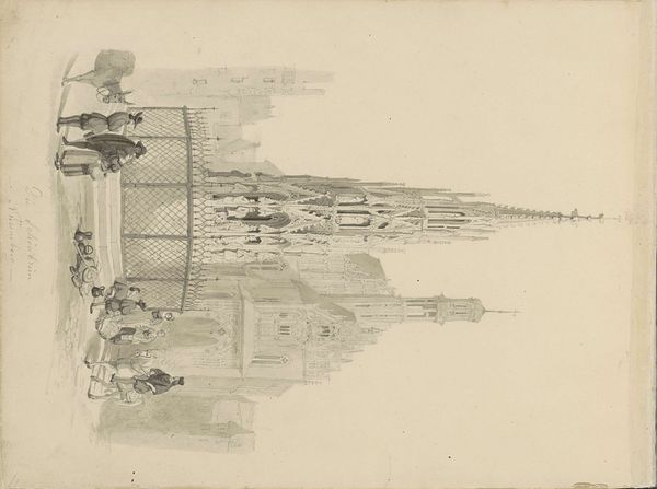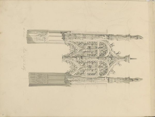 Editor: This is "Façade van de Kathedraal van Senlis," a pencil drawing on paper from around 1850 by Pierre Joseph Hubert Cuypers, currently at the Rijksmuseum. The delicate linework really captures the intricate detail of the cathedral's facade, but it also feels incomplete, almost like a memory fading at the edges. How would you interpret this piece? Curator: The incompleteness you mention is key. Consider the 19th century's fascination with ruins and historical preservation. This sketch, seemingly a simple architectural study, exists within a larger cultural moment. Cuypers, later a significant figure in Dutch neo-Gothic architecture, likely created this as part of his own education and artistic development, an exploration of form. Editor: So, it's less about the cathedral itself and more about how Cuypers was studying the Gothic style? Curator: Precisely. Think of the intense debates around architectural restoration in the mid-19th century. Figures like Viollet-le-Duc in France advocated for "re-creating" a building to its supposed original state. Cuypers, in his later work, actively participated in this reconstruction of national architectural identity. Does this inform how you view the image now? Editor: It does! Knowing Cuypers's later work gives this sketch a new weight. It feels less like a simple observation and more like an early step in a much larger project of defining and promoting a specific architectural aesthetic with a relationship to the nation-state. I hadn’t considered the political implications before. Curator: Exactly. This modest drawing connects to broader social and cultural forces at play in 19th-century Europe. Art is never truly divorced from its context. Editor: I learned so much, thanks. I’ll remember to consider that art is more about culture than anything else. Curator: A useful insight that opens doors to interpreting art's lasting effects on us.