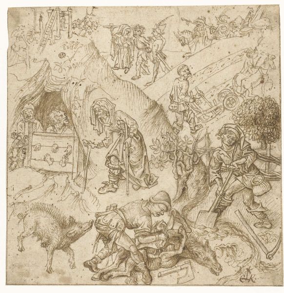 This drawing of "Erminia and the Shepherds," from an unknown artist, presents a densely populated pastoral scene rendered in delicate lines. The composition is divided into distinct registers, with the narrative unfolding across a landscape filled with figures and animals. The artist employs a structural layering of characters, positioning Erminia on horseback as a focal point that is balanced by the figures in the lower right. The use of line creates a dynamic contrast between the detailed foreground and the more ethereal background, where cherubic figures float amidst clouds. The materiality of the drawing is evident in the artist's precise handling of line work which serves to define forms and evoke depth. The artist uses diagonals to engage the viewer's eyes, creating visual pathways that lead through the drawing, inviting us to examine the underlying structure of this complex scene. This work destabilizes traditional notions of landscape by prioritizing character interaction. It engages the semiotic interplay between foreground, middle-ground, and background.