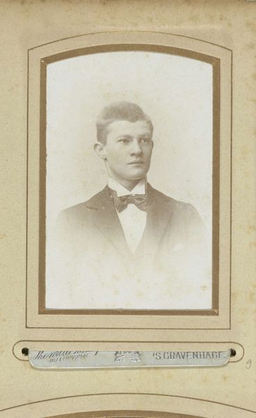 Editor: This is "Portret van een jonge man," a photographic portrait created sometime between 1850 and 1900 by H. Berghäger. The monochromatic palette creates a very stoic, formal feel. I'm curious, what stands out to you most about the formal qualities of this photograph? Curator: Initially, it's the subject's gaze. His eyes possess a sharpness that contrasts with the soft focus characteristic of photography of this era. Examine the tonality: the interplay of light and shadow sculpts his features with subtle gradations. Note how the tight framing accentuates the composition. Editor: Yes, the focus is definitely drawn to the subject’s face. And the sharp details of his attire versus the soft focus of the background makes a statement, right? Curator: Precisely. It presents a fascinating paradox. The crispness of the details—the cut of his jacket, the set of his tie—demands attention. They suggest a meticulous concern with representation and contribute a feeling of self-assuredness. Editor: That’s a really great observation, thank you! Seeing it this way really helps. Curator: It’s about interpreting what we see through formal understanding and analysis. Considering how the various elements relate to one another brings new meaning to the whole image. Editor: Absolutely. This close observation has shifted my perception; now I appreciate the subtleties even more. Thank you.