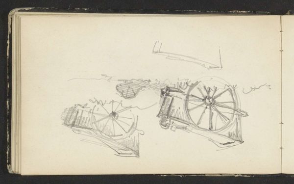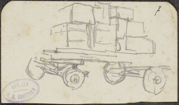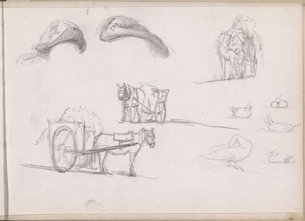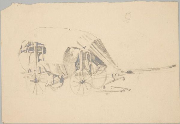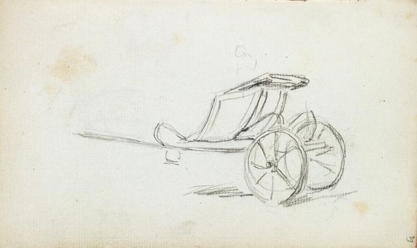 Curator: Willem Witsen's drawing, "Paard voor een rijtuig met twee wielen," which translates to "Horse Before a Two-Wheeled Carriage," sketched between 1888 and 1891, gives us a glimpse into everyday life through the lens of Impressionistic Realism. Editor: It has an unfinished feel to it. There's a sense of transience, like the horse and carriage are captured mid-motion. The sketchy quality, achieved through graphite and pencil, lends it a very immediate, almost journalistic feel. Curator: Witsen was deeply embedded in the cultural shifts of his time, and it is intriguing how he focused on ordinary scenes. This sketch really speaks to the changing urban landscape as Amsterdam rapidly modernized. One wonders who the people who were riding in that two wheeled carraige could be and why he wanted to draw it. Editor: Yes! It invites reflection on societal power dynamics. Who owned these carriages, who drove them, and whose lives were most impacted by this new urban reality that he captured. And if one considers that, back then, horses were also a major component to waste accumulation, then he might actually capture one of the starting point from a social problematic. Curator: Considering his associations with the Amsterdam Impressionists, this study also reflects the influence of their dedication to capturing the fleeting effects of light and atmosphere in everyday scenes. And even more, he captures his context by just focusing into a Horse and the wagon without actually having the need of focusing on people Editor: Definitely, and the limited use of materials creates an immediacy. It feels less posed, and more observed. It's a fragment of a bigger story and gives hints about class and work division Curator: Exactly! It’s in Rijksmuseum's collection because, even a quick drawing can capture an epoch in the history of a country. Witsen’s urban scenes are not just cityscapes; they're socio-historical documents. Editor: It is through this piece that we realize the true ability to reveal those deeper textures of life and the era, using the streets and figures as tools for this purpose.