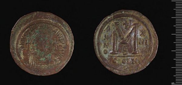 Curator: Here we see a bronze coin, titled "Coin of Justinian I," residing here at the Harvard Art Museums. Editor: Isn't it remarkable how much history is etched onto such a small, unassuming surface? It gives me an almost melancholy feeling, thinking of the hands it passed through. Curator: The coin’s imagery is quite deliberate. On one side, we observe a portrait of Justinian, encircled by inscriptions. Editor: And the other side, a large 'M', presumably a monetary denomination, all rendered with a stark, almost brutal simplicity. The symbolism seems so… direct. Curator: Indeed, there’s a clear visual language at play. The coin embodies power and authority through precise lines and forms. Editor: It's a poignant reminder that even the smallest object can speak volumes about its time, its ruler, and the lives it touched. Curator: Yes, a convergence of artistic expression and socio-political messaging in one carefully crafted object.