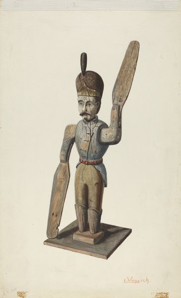 Eldora P. Lorenzini made this drawing, titled Santo Bulto, in 1938 using graphite and watercolor. Lorenzini’s drawing depicts a hand-carved sculpture of Santiago, or San Diego, on horseback. Santo Bultos such as this one are devotional objects, often found in homes, churches, and other sacred spaces throughout the southwestern United States. The original sculptures are made from wood, often cottonwood, a lightweight material easy to carve with simple tools. The figure is depicted holding a spear, or sword, aloft in his right hand, ready to strike. The artist sensitively captures the texture of the wood, the rough carving marks, and the application of paint. Lorenzini’s choice of watercolor on paper translates the three-dimensional object into a two-dimensional image, and it invites us to consider the labor involved in both the original carving and its painted surface. This drawing collapses any assumed hierarchy between 'fine' art and 'craft', underscoring the cultural significance and devotional power of these handmade objects.
