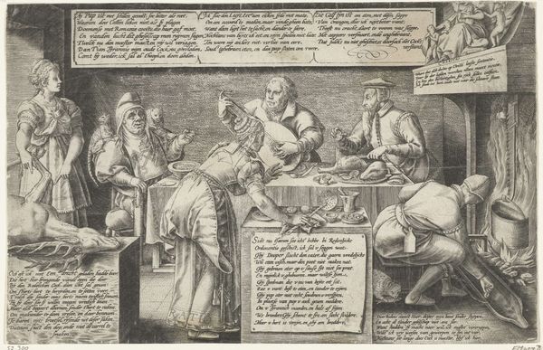 Curator: This is Pieter van der Heyden's "Het spel tegen de monniken," an engraving from around 1570, housed at the Rijksmuseum. It's quite striking, isn't it? Editor: It is! The composition is really intriguing. There's so much going on - figures playing cards and backgammon, others with elaborate religious garb… There's a sense of drama and maybe even a bit of chaos. How do you interpret this work? Curator: I see it as a potent piece of visual rhetoric, steeped in the religious and political tensions of the Reformation. Look at the central figures: a lavishly dressed clergyman is playing a game of backgammon with monks, while others are engrossed in cards. Don't you think it’s interesting how van der Heyden uses this mundane setting of games to represent deeper power dynamics and perhaps even critiques of religious authority? Editor: That makes sense. So the game isn't just a game; it's a metaphor? The engraving seems to accuse them of wasting time with games and neglecting their duties. Curator: Precisely! It speaks to a broader concern of the time – corruption within the Church. Do you notice the text boxes in the four corners of the engraving? In these, van der Heyden makes overt, textual attacks at the Catholic Clergy. The imagery then becomes another battleground through which one could voice reformationist arguments, and challenge the perceived moral failings of the Catholic Church. What do you make of that tension? Editor: It layers in a level of complexity. It seems the artist really wants to criticize this behaviour. Thank you, I would have just seen some people gambling in fancy garments. I have learnt to see this in the appropriate cultural and social contexts of the 16th century. Curator: Indeed. And seeing the art through the cultural wars helps unveil a historical understanding and the social dynamics within that era.