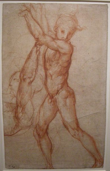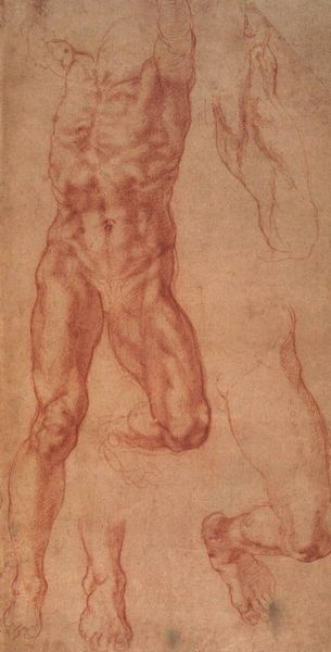 Curator: Looking at this study, "Two Figures", you immediately get a sense of raw, unfinished power. What’s your take? Editor: There's a melancholic undertone. They seem burdened, almost collapsing under some unseen weight. Are these studies for a larger composition? Curator: It’s suspected they may relate to the Sistine Chapel ceiling. But let’s look at the toned paper—a scarce and costly commodity in its time. Think about the artisanal workshops where pigments were ground, and the careful application needed to get such even coverage, allowing Michelangelo to then render figures with charcoal and possibly oil pastels with such precision. The material preparation alone signifies considerable expense. Editor: Absolutely, and knowing the cultural context reinforces the artistic choices. The commission for the Sistine Chapel was hugely significant for the papacy, a very public display of wealth and power. This drawing offers a glimpse behind the scenes, as the Renaissance was being made. Was it a demonstration of papal authority or even personal piety? Curator: Interesting idea! But look closely at the overlapping forms, the deliberate cross-hatching that builds volume and musculature. I wonder whether the artist was thinking about how drawing with light is the key to depicting anatomy, to convey form through the tonal control—or simply honing a skill! Editor: Possibly both! This reminds us how even preliminary sketches became important displays of artistic skill and status in a competitive patronage system. Curator: True! They weren't just disposable exercises. And given that red chalk was much easier to transport than painting materials, this drawing becomes a valuable insight into the practice of on-site consultation and artistic flexibility required by masters such as Michelangelo. Editor: Well, considering this study's purpose and possible associations adds depth to the simple act of observation. We see not just figures, but reflections of power, labour, and the crafting of artistic identity. Curator: Precisely. "Two Figures" is really more than just line work; it reveals a network of relations in the art market during the High Renaissance!