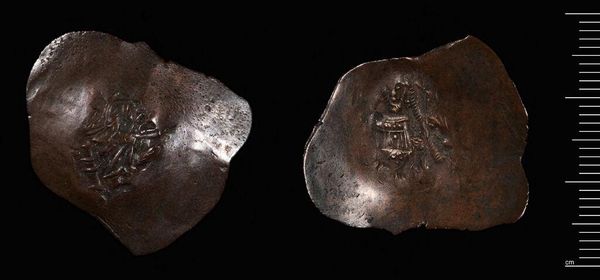 Editor: Here we have a fascinating artifact: a Bulgarian imitation of a trachy, likely of Manuel I. The imagery is striking, even in its worn state. What symbolic weight do you think these images carried? Curator: Ah, yes, observe how the imagery on this imitation coin, while rough, still echoes the power dynamics of its time. It attempts to replicate the authority and legitimacy associated with Manuel I. Consider how the act of imitation itself functions as a form of cultural memory, of aspiration. Editor: So, even a copy can carry its own symbolic charge? Curator: Precisely! It speaks volumes about the relationship between the imitator and the imitated. What does it tell us about Bulgarian society at that time? Think of it as cultural and political messaging. Editor: I see, the imitation tells a story beyond just the image itself. Thanks! Curator: Indeed. It is the enduring power of symbols to communicate complex ideas across time and cultures.