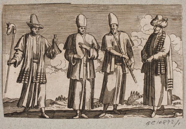 Editor: Here we have Vittore Carpaccio's drawing, "Three Figures," made with ink and charcoal during the Renaissance. They look like characters in a play, but I can't tell what story is unfolding. What do you see in this piece? Curator: The power of imagery resides in its layered ability to convey complex cultural and historical information. Look closely at these figures. The hats, the robes, and even the sword carried by the figure on the right—they all signal a very specific kind of status. Do you notice how these details might tie into Venice's political structure during the Renaissance? Editor: Hmm, I hadn't really thought of that. So, the clothing isn't just decorative, it's symbolic of their position? The guy on the left almost seems to be looking outside the frame while the others seem deep in a conversation that we, the viewers, are not privy to. Curator: Precisely. Think of clothing, gestures, even the way they stand as languages in themselves, revealing the nuances of identity and social relationships of the time. Their garments reflect both wealth and specific societal roles. Their gestures are also not accidental. It is interesting to consider how posture and expression affect the dynamics of their conversation, or lack thereof. Editor: So, by studying these visual symbols, we can understand more about Renaissance society in Venice. That's fascinating! Curator: Yes. Carpaccio provides visual clues, but it is our cultural memory and collective history that complete them, bringing us closer to the world of Renaissance Venice. Editor: I guess every little detail has some type of hidden meaning. Thanks for opening my eyes to that.