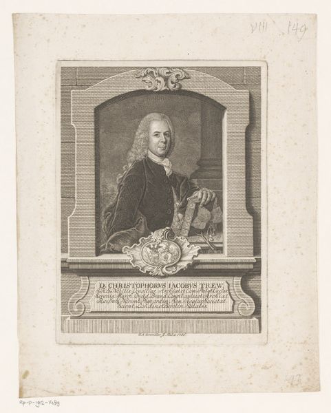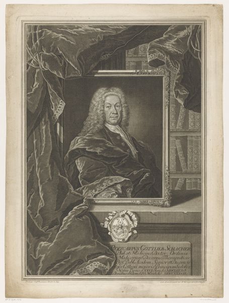 Editor: So, this engraving from between 1729 and 1733 is titled "Portret van Heinrich Friedrich Walther," created by Martin Bernigeroth. It feels quite formal, almost like a stage production with the drapery and the oval frame. What stories do you see in this piece, framed as it is by its own time and ours? Curator: It's crucial to consider the social function of portraiture during the Baroque period. This isn’t simply an image; it's a statement about status, power, and legacy. How does the visual language – the pose, the clothing, the framing – contribute to this declaration? Do you think this portrait was meant for public display? Editor: Absolutely! The formality practically demands to be seen. The Latin inscription further elevates him, placing him within a historical and intellectual tradition. I’m wondering how accurate a portrayal it would have been though, or rather how idealized. Curator: The "accuracy" is less about a true likeness and more about constructing a desired image. Consider the institutional forces at play. Who commissioned this portrait, and what message were they hoping to convey about Walther and themselves? The choice of engraving, a reproducible medium, speaks volumes about dissemination and public image. How might the subject have wished to be seen by his contemporaries versus future generations? Editor: So, the context defines its purpose. It’s about controlling the narrative, shaping public perception in a deliberate and lasting way. Seeing it like that, even the baroque style itself takes on new weight. Curator: Precisely. And thinking about this now, we must consider how the Rijksmuseum, as an institution, participates in shaping Walther’s continued legacy. The portrait now has its own historical significance shaped by our present understanding. Editor: That gives me a lot to think about – it is both a preserved history, and always recontextualized.