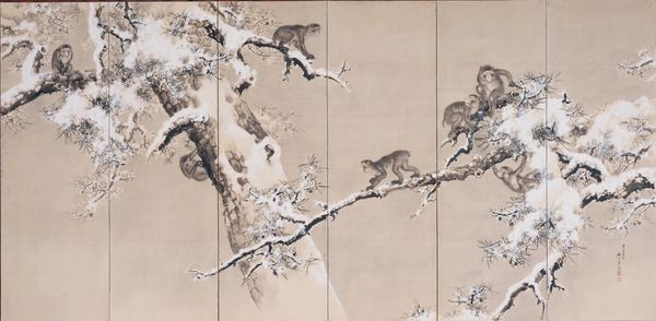 "Tigers by Mountain Streams," is a six-panel screen made with ink, color, and gold leaf on paper, by Kishi Chikudō in the later half of the 19th century. During the Edo and Meiji periods in Japan, paintings of tigers became popular, often displayed in homes to ward off evil. Yet, because tigers were not native to Japan, artists relied on Chinese paintings or descriptions, leading to fantastical representations. Here, the tigers exist in an ethereal landscape, their forms both powerful and gentle. The mother's protective gaze and the cubs' playful innocence challenge traditional symbols of fear, inviting viewers to consider the multifaceted nature of existence. This art piece reflects a reverence for nature and the emotional resonance of family bonds, offering a space for reflection on the self and the world.