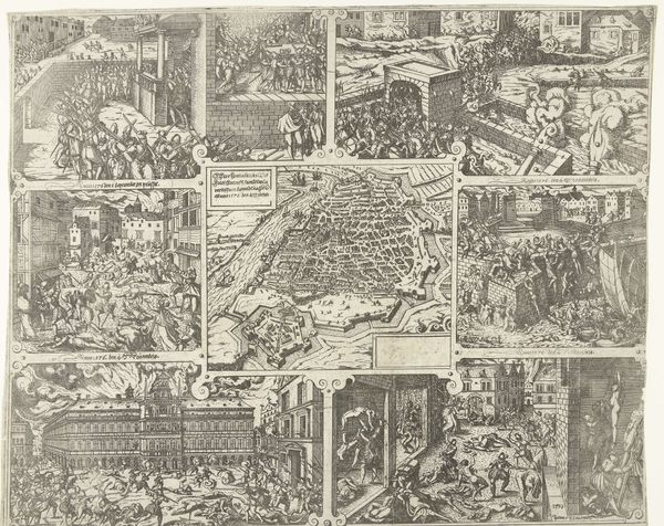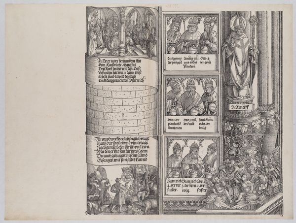 Editor: So, this enormous print—it’s actually several panels joined together—is called "The First Flemish Rebellion; The Campaign Against Liège; The Coronation of Maximilian; The Second Flemish Rebellion; The Alliance Between Philip I of Castile and Henry VII; The Victory Against France.” It was created in 1515 by Hans Springinklee. The detail is incredible for a woodcut and engraving. I’m immediately struck by how much violence and political maneuvering it depicts. How do you even begin to unpack a piece like this? Curator: It's a visually arresting piece, isn't it? Think about what this arch, this ‘Arch of Honor,’ was meant to convey. It's not just a historical record; it's a carefully constructed piece of propaganda, attempting to solidify the power and legitimacy of the Habsburg dynasty, specifically Emperor Maximilian I. Consider how the artist uses visual language to portray different power dynamics. Who is given prominence? How are victories framed, and what’s conveniently left out? This isn't a neutral retelling; it's a strategic narrative designed to shape public opinion. Do you see how different social classes might respond to such a display of power? Editor: I suppose the emphasis on military victories and alliances is meant to inspire awe and project strength, but to me, it also highlights the cost of such power—the endless conflicts, the subjugation of different groups. Are these “victories” necessarily just if they rely on violence and oppression? Curator: Precisely. It forces us to question the glorification of military might and consider whose stories are being erased or manipulated. The artist presents a very specific perspective on these events, one that favors the ruling class. Thinking critically about the narrative framing allows us to challenge the accepted historical accounts and explore the experiences of those who were marginalized or actively harmed by these power struggles. Editor: It’s fascinating how a single artwork can contain so many layers of meaning, power, and propaganda. Thanks for opening my eyes to the narratives at play. Curator: It’s a good reminder that even seemingly straightforward historical depictions can be deeply embedded in power structures. Art provides fertile ground for examining these dynamics critically.