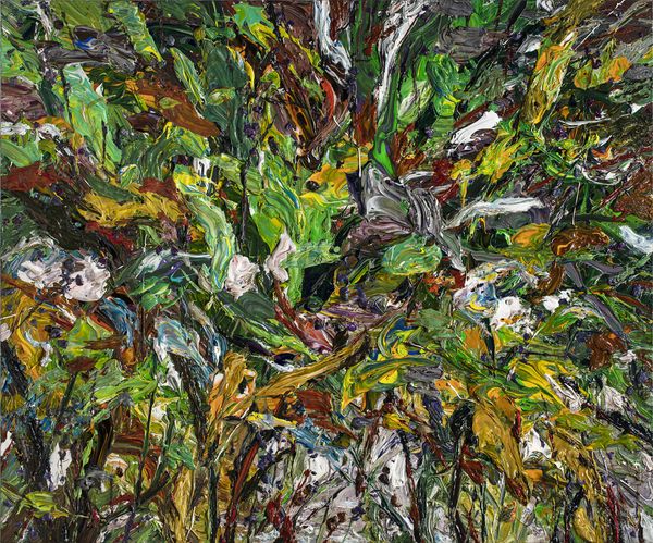 Curator: Ah, I am immediately drawn into its turbulent energy! It feels like peering into the heart of a storm, doesn’t it? Editor: Indeed. We're observing Wang Xinfu's "\u98ce\u5316\u77f3\u5899," rendered in 2020. This piece exemplifies matter painting, a style that brings forth profound reflections on materiality itself. The artwork's name translates to “Weathered Stone Wall." Curator: "Weathered Stone Wall," fitting, considering the textures! There is an urgency in these layers, the impasto creating tangible peaks and valleys of acrylic paint, demanding that we see not just color, but form. Editor: Precisely! Look at the contrasting values. Notice the way the light, golden hues interact with the deep umber and obsidian. These colours carve out paths that guide the gaze and dictate where we are to focus, but offer little rest to the eyes. The artwork verges on the overwhelming! Curator: Overwhelming in a delightful way. Don’t you think there’s a visceral quality at play? Almost geologic, like witnessing a mountainside both erode and rise up at once, an assertion and a dissolution! It certainly echoes the principles of abstract expressionism. Editor: Quite. I concur with that insight. And in observing the construction of the painting, it reminds me somewhat of a musical score with dynamic sweeps of thick texture that cascade, juxtapose and even compete with each other for space within the frame. Curator: That’s a vivid metaphor, very apt. As you mentioned earlier, the piece, considered under the umbrella of matter painting, challenges us to think about not only what is represented but what makes up that representation. Editor: To be certain! One senses an element of entropy and renewal in this “Wall," a testament to both ruin and reconstitution. Wang appears to show us that destruction is not necessarily the end of things. Curator: Absolutely! The way in which materiality, colour, and composition entwine presents a rich, expressive visual encounter, indeed! I’d certainly suggest spending additional time with this piece. Editor: I am with you on that. I leave this conversation even more compelled to return for another immersive session.