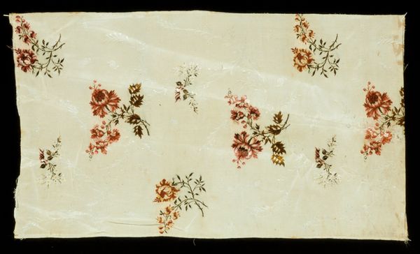 Curator: This delightful piece, dating from sometime between 1800 and 1900, is called "Sheet with overall dot pattern with bouquets." Created by an anonymous artist, it employs watercolor, coloured pencil, and print techniques on paper. What are your initial impressions? Editor: It’s…charming. Intimate, almost. The repeated floral motifs and delicate dot pattern evoke a feeling of handcrafted beauty, something from a personal diary or the inside cover of a book. The faded colours suggest age and history. Curator: Precisely. Floral patterns have, across cultures, served as potent signifiers of fertility, renewal, and even remembrance. In the Victorian era, particularly, specific flowers carried encoded messages—a whole language of symbolism. Editor: It's fascinating to consider how the social context might have influenced the selection and arrangement of these particular floral images. This piece surely reveals a very intimate part of someone's aesthetic interests, right? It may even have served as design inspiration for larger works, like textiles or wallpapers. Curator: Or consider how it may be an expression of longing or sentimental emotion. The artist would make repetitive patterns which have the qualities of a meditative and healing experience for the mind and soul. Perhaps there is the aspect of using creativity to express emotions that could not be stated publicly at the time. Editor: You're right to point that out. Given the possible context, these humble patterns potentially serve as an early manifestation of social media, reflecting widespread artistic interests in printed designs. Curator: Indeed, objects like this can offer a more vivid reflection of past trends. They also demonstrate the enduring human inclination to create, decorate, and imbue our everyday surroundings with symbolic meaning. Editor: Yes, viewing art that was considered more commonplace offers unique insights. I agree— it underscores how even the seemingly small or ordinary carries cultural and social significance, ready for deeper investigation.