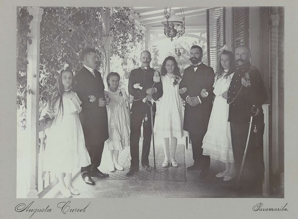 This wedding photograph, made with who knows what kind of camera, shows us a moment caught in time. The surface is soft, like a memory fading around the edges. Look at the way the light falls, creating subtle variations in tone. The composition is meticulously arranged, with the wedding party posed in neat rows. The eye is drawn to the bridal couple, central in the frame. The contrast between the dark suits and light dresses creates a visual rhythm, but it's the subtle differences in texture that really catch my attention. Each face, each garment, has its own unique quality, brought out by the light. It makes me think about how even in a group portrait, individuality can still shine through, like different brushstrokes working together to make a whole. It makes me think of someone like Alice Neel, who was able to capture so much about a person's character with just a few strokes. It's a reminder that art, like life, is all about relationships and how we connect with each other. It's not about perfection, but about embracing the beauty of imperfection.