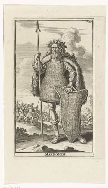 Curator: What a pensive fellow! Salvator Rosa's "Copy after the Figurine" gives me the impression of a warrior lost in thought, or perhaps just bored on duty. Editor: Yes, but consider how this was achieved. Look at the etching – the delicate, almost scratchy lines that define the armor. It's a testament to printmaking's ability to replicate detail, and how it democratized imagery at the time. Curator: Democratized boredom, perhaps? No, you're right. The fact that Rosa, an established artist, would dedicate his time to copying a figurine shows a certain reverence for craft, for the material process. It tickles my fancy, the layers of remove. Editor: Precisely. It prompts us to think about the artistic labor involved in both the original figurine and this reproduction, and the way that value is assigned to different forms of making. Curator: I love how it makes me question the source, you know? Which one is the art? And what does it mean to take an artwork after another artwork, which in itself represents a person? It's just an endless maze for my brain! Editor: Indeed. Rosa's etching provides a window into the cultural obsession with classical forms, and the evolving role of art in society. Curator: Well, I'm obsessed, too! So many questions, so little time... Editor: Food for thought, indeed.