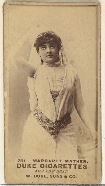 This is a mounted portrait card of the French soprano Marie Roze, made by an anonymous photographer. During the 19th century, the cultural landscape was rapidly evolving, and the rise of opera brought performers like Roze into the public eye, intensifying conversations around gender, fame, and representation. Roze is adorned in what looks like a costume, complete with an ornate headdress and jewelry, which invites consideration of how performers navigated identity. Was she empowered, expressing herself through costume? Or was she constrained, reinforcing social expectations? These questions bring us to the complex negotiations women experienced while constructing their personas within the public sphere. The use of costume and adornment are not merely aesthetic choices; they are assertions of self. What this image really underscores is the complex relationship between personal expression, public perception, and the subtle ways identity is negotiated, particularly within the context of performance and representation.
