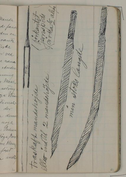 Editor: Here we have "Skitser af sværd, langknive, pallasker, samt angivelser af mål", which translates to "Sketches of swords, long knives, broadswords, as well as specifications of measures," created by Niels Larsen Stevns around 1933-1934. It is an ink drawing on paper. I’m immediately struck by the dynamic energy conveyed through these quick, linear sketches. What can you tell us about the composition? Curator: The immediate focus for me rests on the formal qualities of line and form evident in this study. Stevns masterfully employs line weight variation to differentiate the weapons, some boldly defined, others rendered with delicate, almost ephemeral strokes. Consider the strategic use of the page's ruled lines as an underlying grid, a structure grounding the dynamic sketches, yes? It prevents them from floating aimlessly. Editor: Absolutely, it is a fascinating dialogue between precision and spontaneity. So the artist carefully employs the paper's structure, what about the forms themselves? Are there specific formal relationships you find compelling? Curator: Indeed. The varying blade shapes create a fascinating rhythm. Notice how the curvilinear forms of the sabres on the right contrast with the more rigid, geometric forms of the daggers on the left. It creates a dynamic visual tension. Editor: That is very insightful! The formal elements really contribute to the overall tension within the piece. Thank you for your time! Curator: You're very welcome. Thinking through these forms helps unlock a new appreciation.