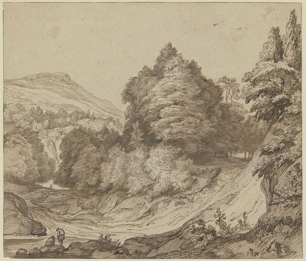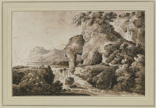 Curator: This delicate artwork is "Uferlandschaft mit Felsbogen," a landscape drawing attributed to Franz Kobell. It's currently held here at the Städel Museum. Editor: My first thought? Serenity. There’s almost a dreamlike quality to it, the way the ink and graphite sort of wash together. It feels…timeless. Like a place you might visit in a memory. Curator: Precisely. Kobell's mastery lies in capturing this specific atmospheric depth through a limited tonal range. Note how he uses subtle variations in shading to delineate form, creating an illusion of depth within a relatively flat plane. Editor: The rock arch dominates the scene. I love the soft light filtering through it. Did that kind of natural rock formation have any particular significance back then, I wonder? It's not just pretty; it feels like a gateway, doesn’t it? Curator: That's astute. Rock arches were often seen within Romantic landscapes, serving as metaphors for nature's power, transition, and the sublime. It represents a border and also a transformation or maybe rebirth... an entrance to the divine. Kobell's choice suggests an engagement with philosophical currents of his time. Editor: And what about the two figures on that smaller rock in the foreground? Are they just enjoying the view? Or is there something more we're supposed to read into them? They add an intimate human element to this otherwise grand, impersonal scene. Curator: I agree completely. In comparison to the vastness surrounding them, these individuals bring focus, offering scale and highlighting nature's immensity and possibly mankind’s relationship within it. Kobell may also subtly imply humanity's capability to connect with the surrounding beauty. Editor: Looking at it again, it is deceptively simple, this drawing, but layers are revealed, giving such atmosphere. It's incredible. Curator: Absolutely, and further viewing and study bring new understandings to what Kobell created. The landscape remains a profound engagement.